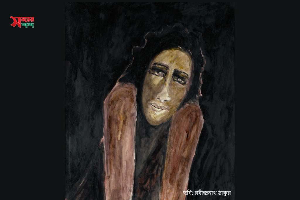 ‘আকাশপথে বাণী তারে ডাক দিয়ে যায় আলোর ঝরনা বেয়ে,/রাতের অন্ধকারে/কোন অসীমের রোদন-ভরা বেদন লাগে তারে!/ বাহির হতে তার ঘুচে গেছে সকল অলংকার,/অন্তর তার রাঙিয়ে ওঠে স্তরে স্তরে, /তাই দেখে সে আপনি ভেবে মরে।/কখন কাজের ফাঁকে/জানলা ধরে চুপ করে সে বাইরে চেয়ে থাকে/যেখানে ওই সজনেগাছের ফুলের ঝুরি বেড়ার গায়ে/ রাশি রাশি হাসির ঘায়ে/ আকাশটারে পাগল করে দিবারাতি।’